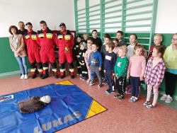 Wszyscy uczniowie byli bardzo uważnymi słuchaczami, a także chętnie dzielili się wiedzą, którą nabyli w trakcie nauki. Nie brakowało także bardzo istotnych pytań, m.in. o to, do jakich zdarzeń należy wzywać straż pożarną. Ponadto ratownicy w trakcie prowadzenia części teoretycznej przypomnieli dzieciom m.in. o sposobie prawidłowego alarmowania straży pożarnej, o niebezpieczeństwie. Pierwsza część spotkania odbyła się na zewnątrz, gdzie uczniowie oraz nauczyciele mieli okazję do zapoznania się ze sprzętem wykorzystywanym podczas prowadzenia akcji ratowniczo - gaśniczych. Uczniom przedstawiono wozy pożarnicze wraz z jego wyposażeniem. Nie zabrakło również takich atrakcji jak: przewiezienie poszkodowanego quadem, czy też możliwość wejścia do wozu strażackiego. Następna część spotkania odbyła się na sali, było krótkie przybliżenie obrazu zawodu strażaka, sprzyjające kształtowaniu pozytywnego wizerunku tej formacji oraz ludzi w niej służących w oczach dzieci. Już na sali dużą ciekawość wzbudził m.in. sprzęt ochrony osobistej strażaka, który niejednemu maluchowi, z racji swojej wagi, sprawił nie lada problem. Strażacy przypomnieli nam udzielanie pierwszej pomocy teoretycznie i praktycznie. Uczniowie bardzo aktywnie uczestniczyli w ćwiczeniach udzielania pierwszej pomocy. Na koniec dzieci oddziału przedszkolnego i klas I III podziękowali strażakom wierszami i piosenką.