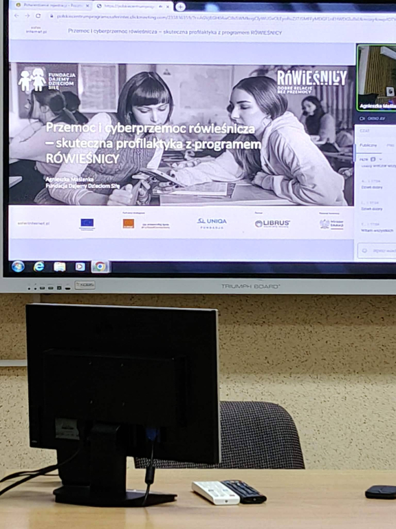 Dla rodziców przygotowano spotkanie informacyjne, podczas którego rodzice obejrzeli webinar „Przemoc i cyberprzemoc rówieśnicza – skuteczna profilaktyka z programem Rówieśnicy. Głównym celem spotkania było zwiększenie świadomości uczniów i rodziców na temat problemu przemocy rówieśniczej oraz cyberprzemocy.