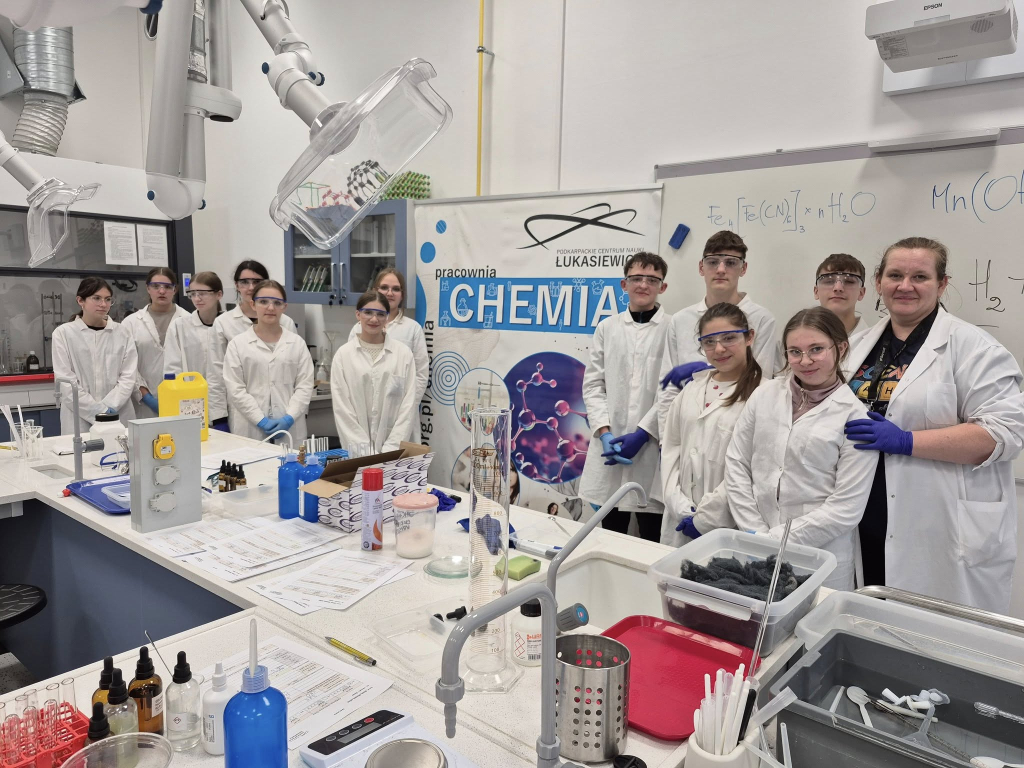Uczniowie klas siódmych i ósmych wzięli udział w warsztatach chemicznych poświęconych właściwościom pierwiastkowego i jonowego żelaza. Warsztaty rozpoczęły się krótkim wprowadzeniem teoretycznym. Uczniowie przypomnieli sobie położenie żelaza w układzie okresowym oraz poznali różnice między żelazem w formie pierwiastkowej a jego jonami – Fe²⁺ i Fe³⁺. Prowadząca wyjaśniła, jak zmieniają się właściwości chemiczne żelaza w zależności od stopnia utlenienia oraz jakie znaczenie mają te formy w przyrodzie, technice i życiu codziennym. Następnie rozpoczęła się część doświadczalna, która okazała się najbardziej atrakcyjnym elementem zajęć. Uczniowie mieli okazję wykonywać samodzielne eksperymenty, m.in.: obserwowanie reakcji żelaza pierwiastkowego z kwasem solnym i wydzielanie wodoru, wywoływanie charakterystycznego zabarwienia roztworów jonów Fe²⁺ i Fe³⁺ przy użyciu odczynników wskaźnikowych, przeprowadzanie reakcji prowadzących do strącania osadów wodorotlenków żelaza, obserwację zjawiska utleniania jonów Fe²⁺ do Fe³⁺.