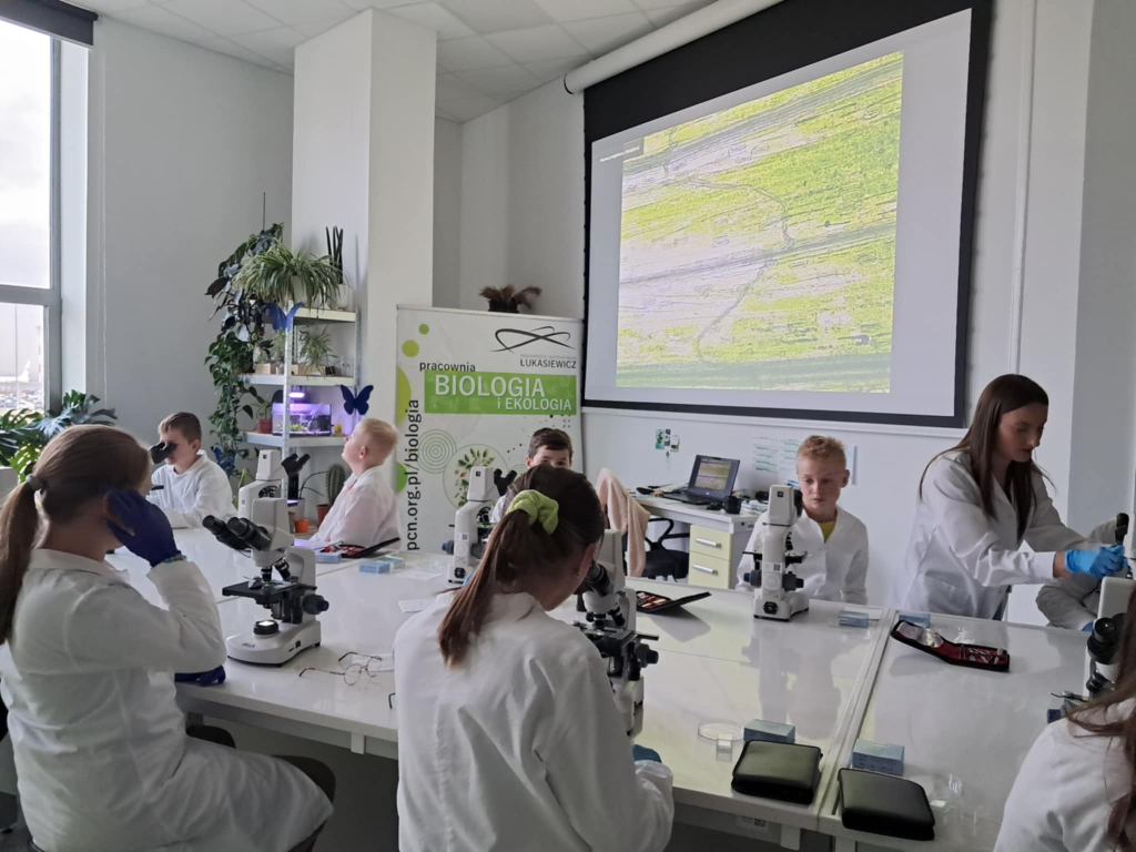 Uczniowie klas 4–6 wzięli udział w warsztatach biologicznych pt. „Świat w detalu”. Podczas zajęć mieli wyjątkową okazję po raz pierwszy pracować w prawdziwym laboratorium biologicznym. Uczniowie samodzielnie przygotowywali próbki do obserwacji pod mikroskopem, poznając zasady pracy z tym niezwykłym urządzeniem. Wykonali aż trzy preparaty: komórki roślinnej, grzybowej oraz zwierzęcej. Dzięki temu mogli z bliska zobaczyć, jak różnorodny i fascynujący jest mikroskopijny świat żywych organizmów.